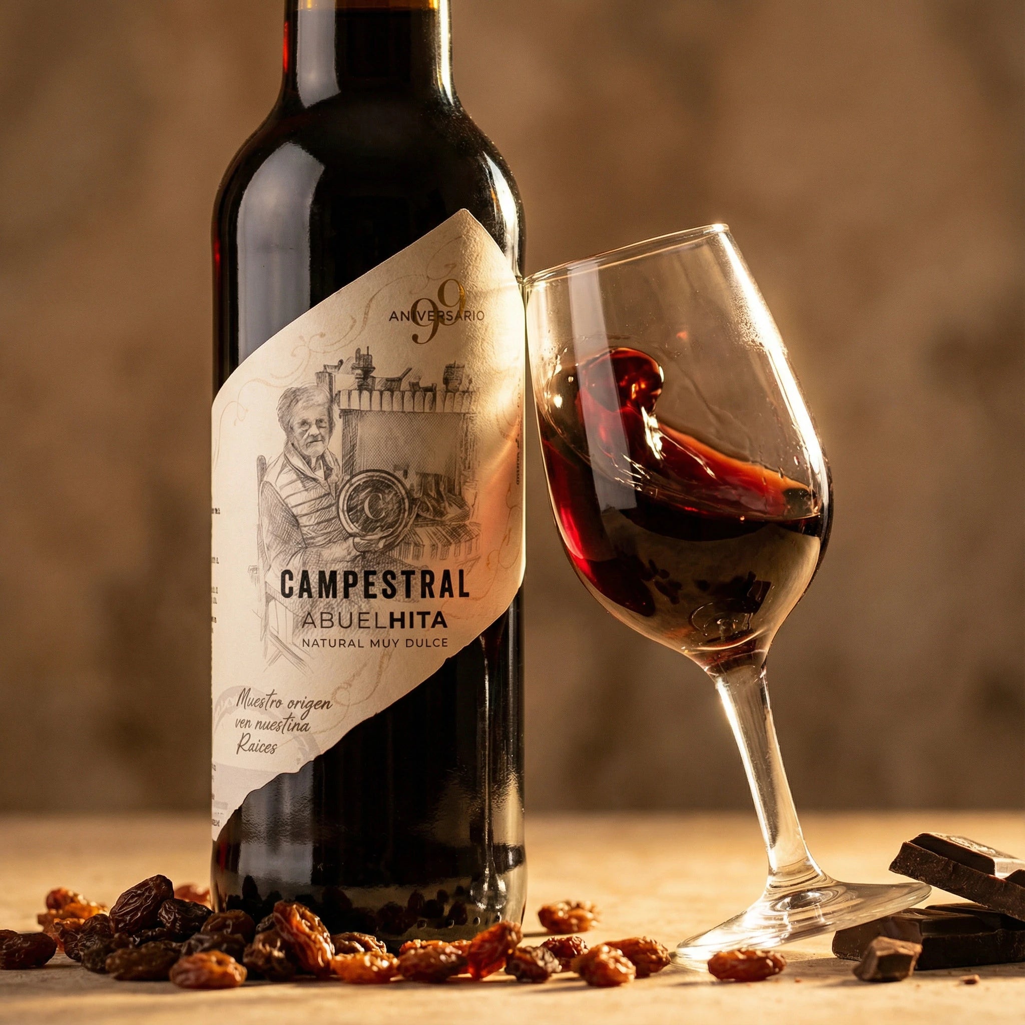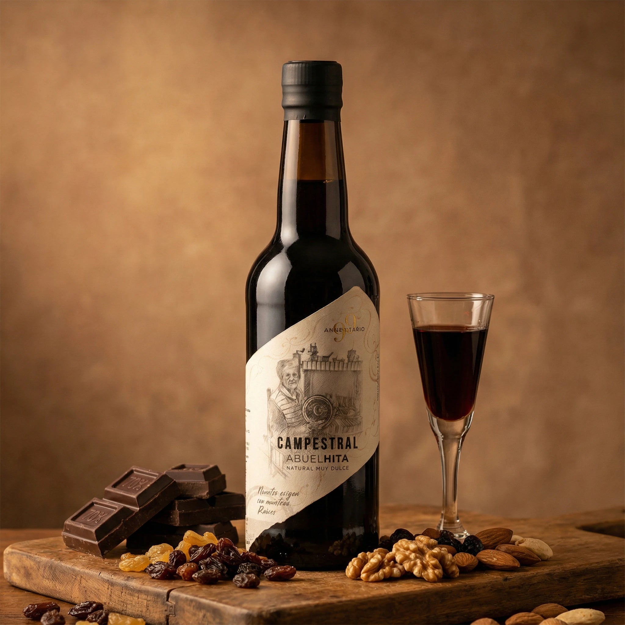 El AbuelHita, elaborado con Tintilla de Rota, Merlot y Petit Verdot, captura la esencia de la tradición vinícola mediante el método artesanal de soleo. Este proceso, en el que las uvas se pasifican bajo el sol, concentra sus azúcares y sabores, creando un vino dulce y sofisticado. Con una producción limitada a menos de 500 botellas anuales, es un tributo a Dolores Hita Diánez, conservando el legado artesanal de Campestral.